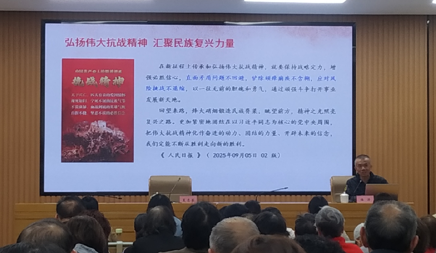 2025年10月20日,本支部参加了江东街道党委举办的第七期党员培训活动,本期的培训课的主题是弘扬伟大抗战精神 汇聚民主复兴力量,由省党校的陆洋教授主讲,街道各社区的书记、支部书记和党员代表们参加了学习。陆教授从三个方面进行了宣讲: