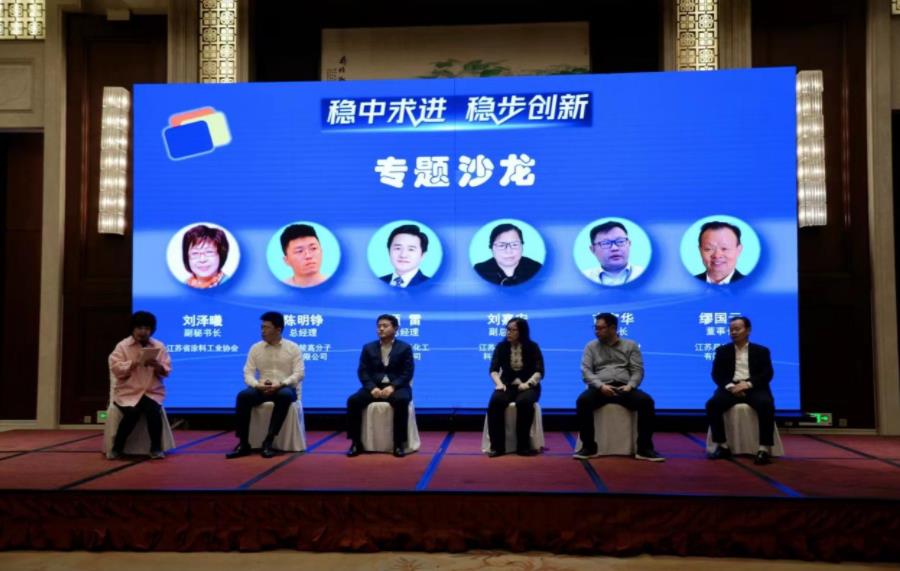 在“稳中求进 稳步创新”主题沙龙环节,大会特邀请苏州吉人高新材料股份有限公司董事长吉富华、江苏兰陵高分子材料有限公司总经理陈明铮、江苏晨光涂料有限公司董事长缪国元、青岛恩泽化工有限公司总经理顾雷、江苏云湖新材料科技有限公司副总经理刘嘉宏5位嘉宾就目前中国及江苏省涂料行业的热点问题展开讨论。