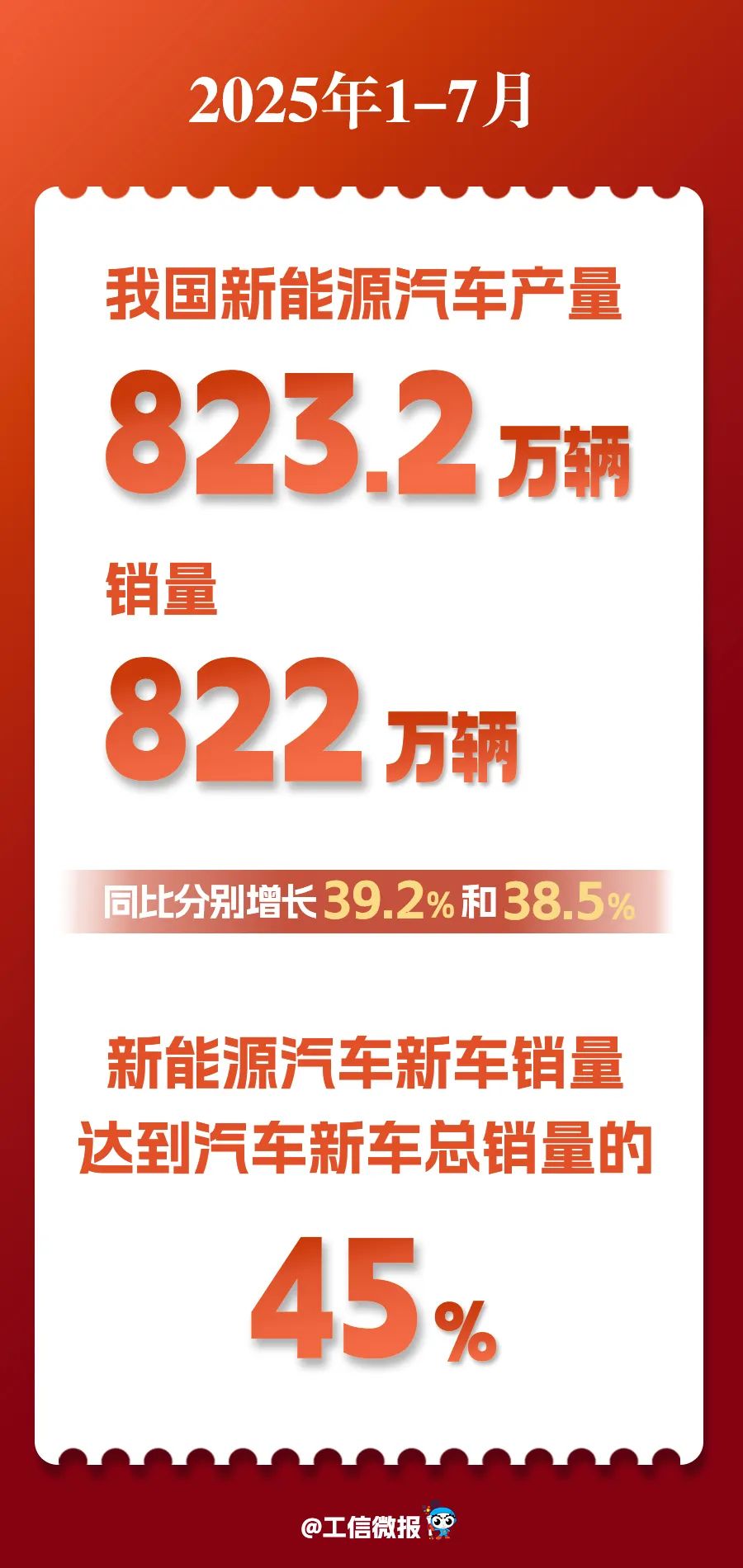 7月,新能源汽车产销分别完成124.3万辆和126.2万辆,同比分别增长26.3%和27.4%;新能源汽车新车销量达到汽车新车总销量的48.7%。1—7月,新能源汽车产销分别完成823.2万辆和822万辆,同比分别增长39.2%和38.5%;新能源汽车新车销量达到汽车新车总销量的45%。