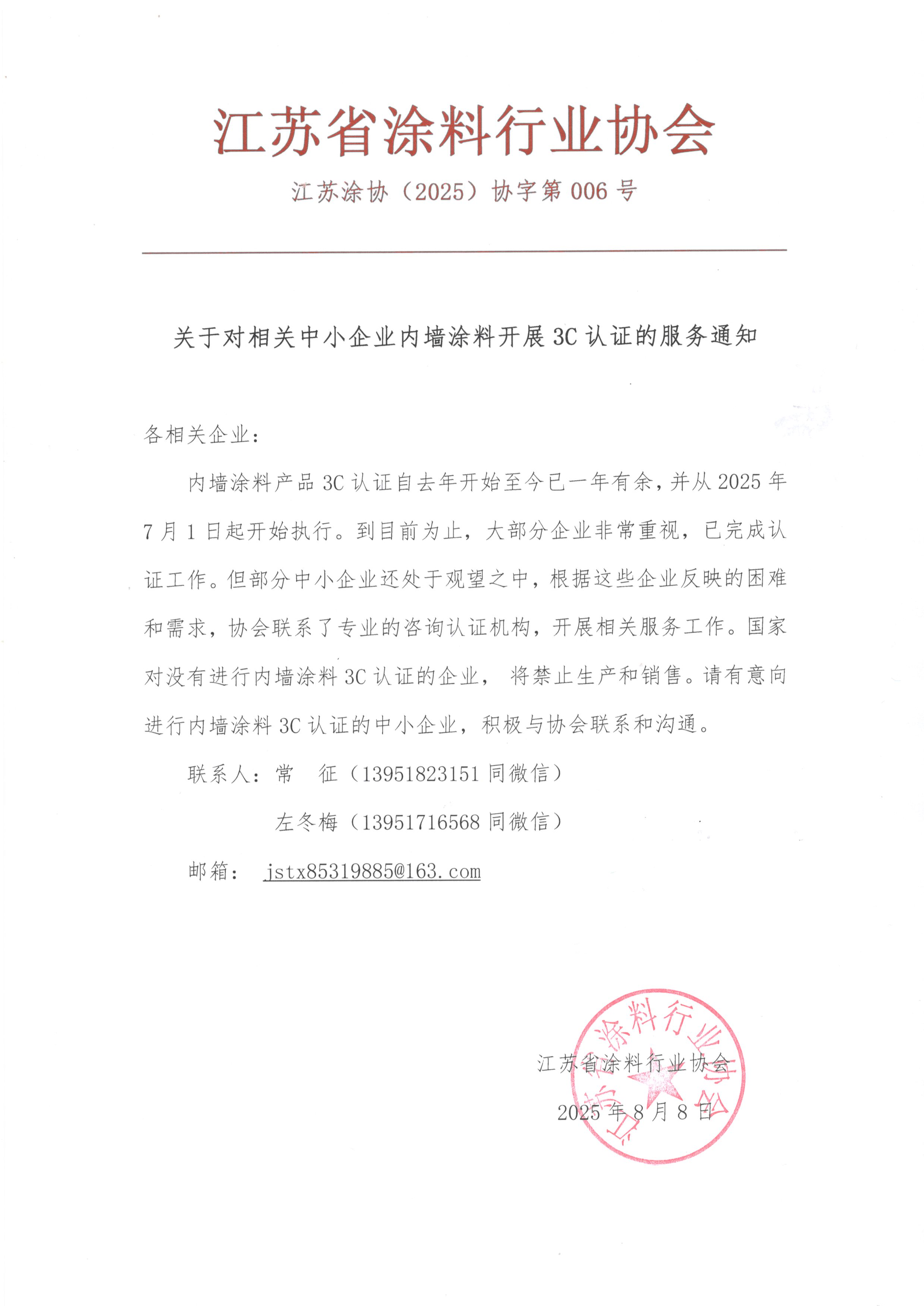 关于对相关中小企业内墙涂料开展3C认证的服务通知